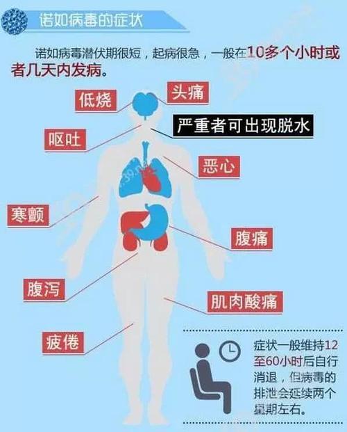 诺如病毒感染引起胃肠炎,胃肠炎是指胃、小肠和大肠的炎症。胃肠炎的症状是恶心、呕吐、腹部痉挛性腹泻。部分人主诉有头痛、发热、寒战、肌肉疼痛。症状通常持续1-2天。普遍感到病情严重,一日多次剧烈呕吐。症状一般摄入病毒后24-48小时出现,但是暴露后12小时也可能出现症状。没有证据表明感染者能成为长期病毒携带者,但是从发病到康复后2周感染者的粪便和呕吐物中可以检出病毒。