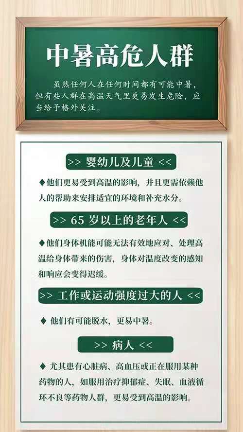 老年人、婴幼儿、儿童、精神疾病患者及慢性病患者最易中暑。同时应注意,在高温天气里进行重体力劳动或剧烈的体育运动,即使是健康的年轻人也可能发生高温中暑,甚至死亡。